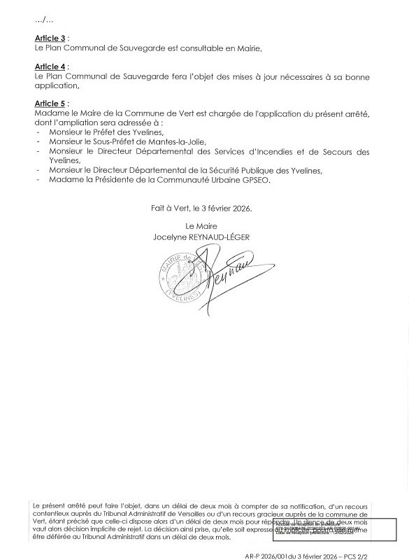 Les communes étant dans l’obligation d’élaborer leur Plan Communal de Sauvegarde, la Mairie de Vert avec l’aide des services de la Préfecture, du service interministériel de Défense et de Protection Civile ainsi que la C.U. GPSEO a pu établir le sien en tout début d’année et le Conseil Municipal a validé sa mise en place par arrêté le 3 février dernier.